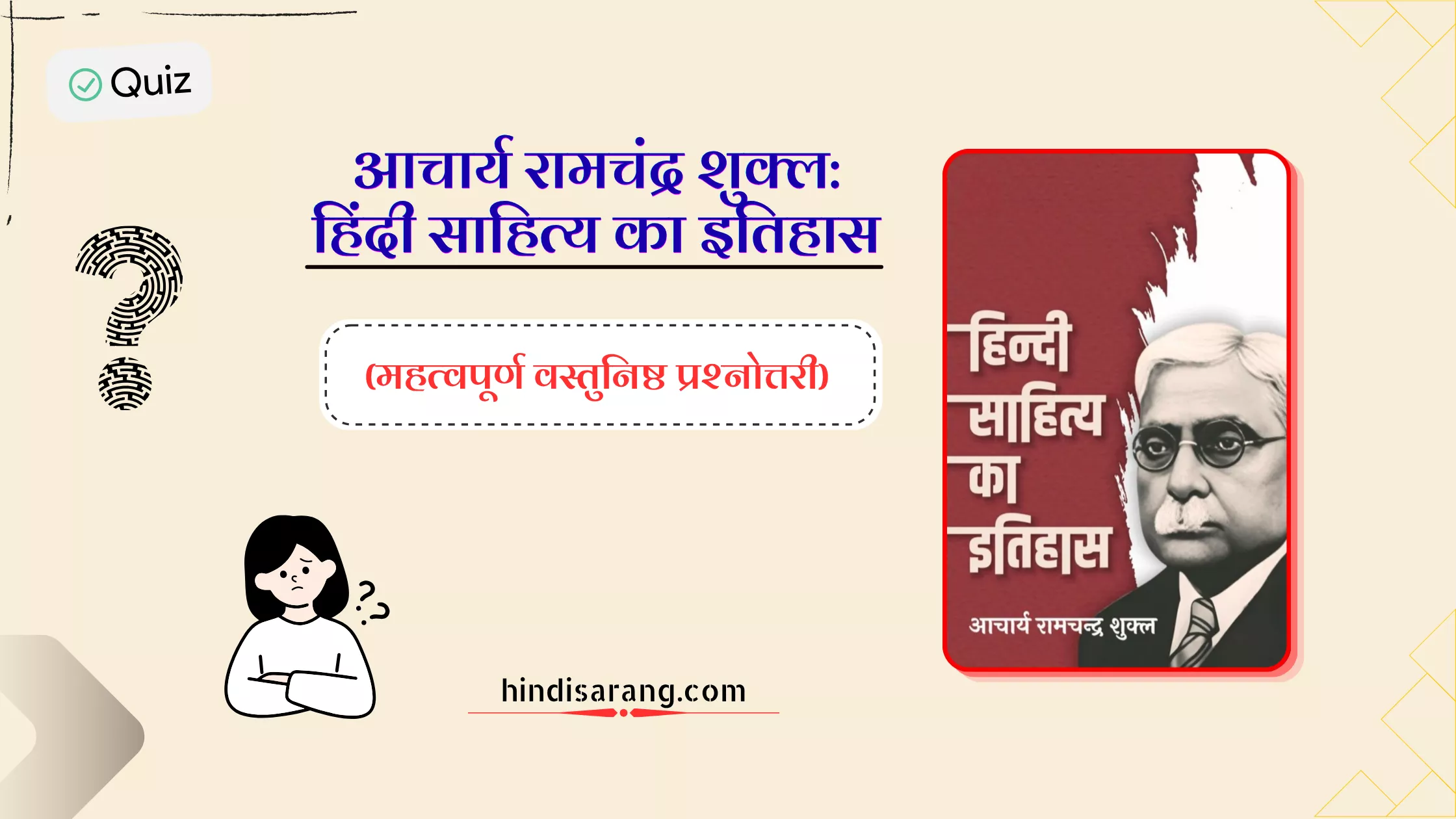 आपकी परीक्षाओं (UP PGT/TGT, DSSSB, Assistant Professor) की तैयारी के लिए आचार्य रामचंद्र शुक्ल के ‘हिंदी साहित्य का इतिहास’ के आधार पर 40 महत्वपूर्ण वस्तुनिष्ठ प्रश्न (MCQs) नीचे दिए गए हैं। शुक्ल जी के इतिहास ग्रंथ पर आधारित यह quiz कालविभाग, आदिकाल, वीरगाथा काल पर आधारित है।